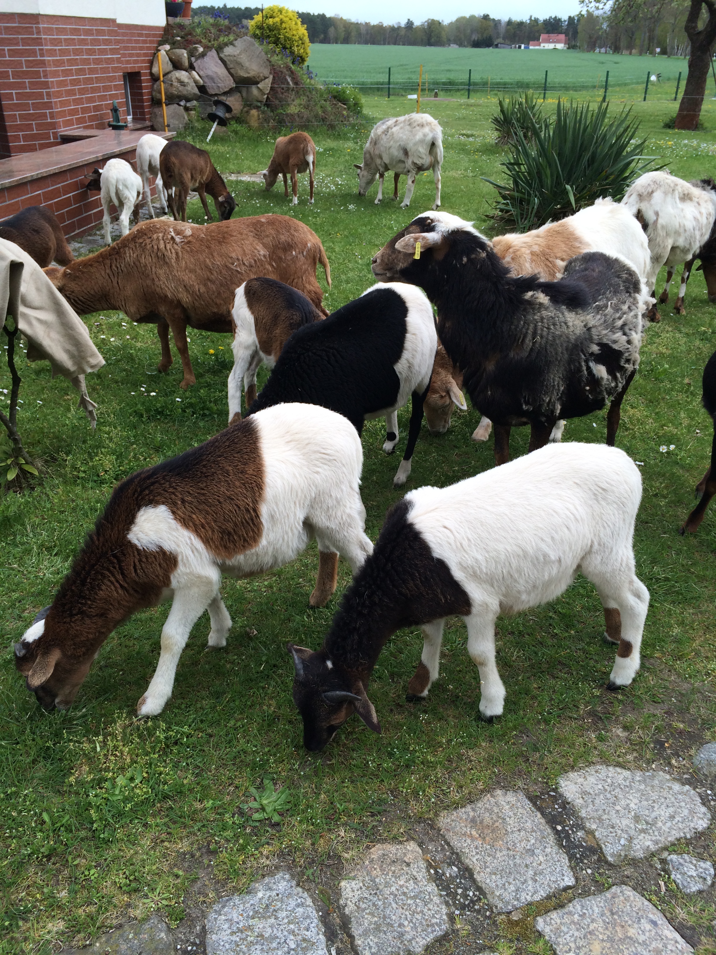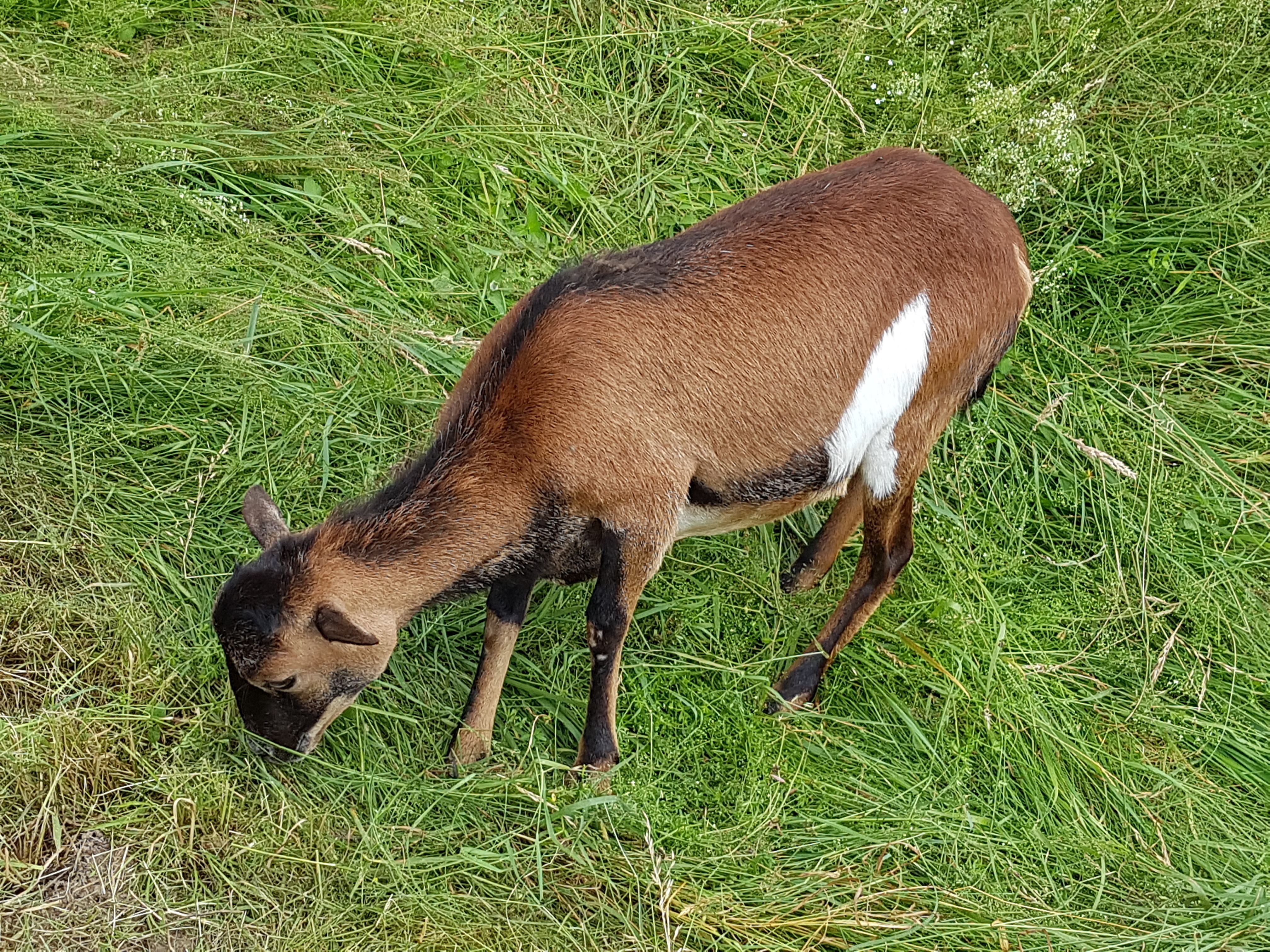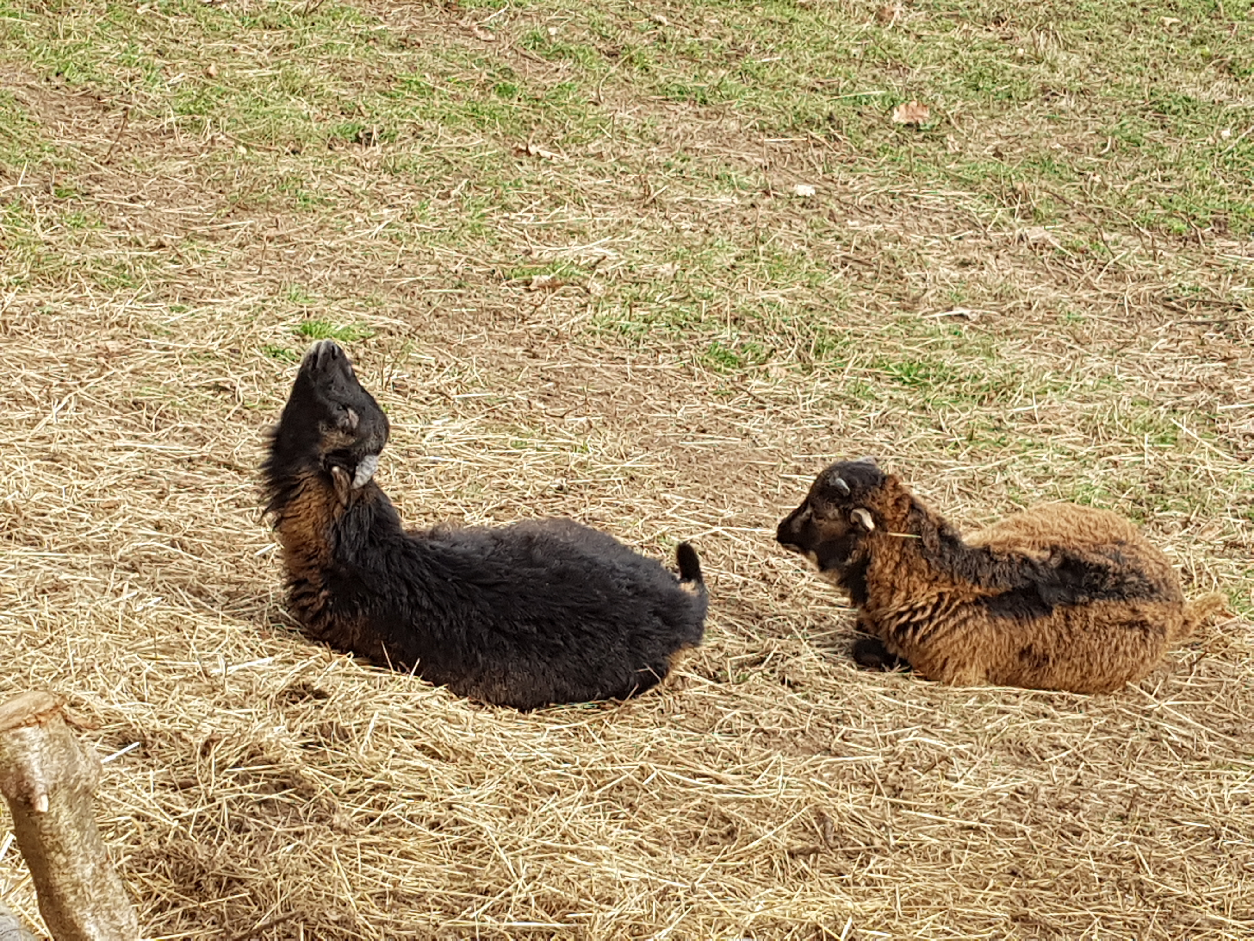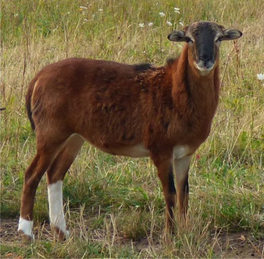 Nun zurück zu den Kamerunschafen. Wie schon erwähnt besitzen auch die Tiere dieses Farbschlages hellbraune Überaugenstreifen, wie zum Beispiel bei den schwarzmarkenen Exemplaren. Diesen ähneln sie in Bezug auf die hellbraunen Abzeichen allgemein sehr stark, man könnte fast sagen der Unterschied besteht nur in der Farbe von Rumpf und Hals. Denn dieses Deckhaar besteht aus zweifarbigem Grannenhaar und schwarzem Unterhaar. Das untere und das obere Viertel der Grannenhaare ist schwarz, der Bereich dazwischen ist gelbbraun gefärbt und macht ungefähr die Hälfte aus. Dieses Zusammenspiel der zweifarbigen Haare ergibt einen wirklich tollen Farbeffekt.
