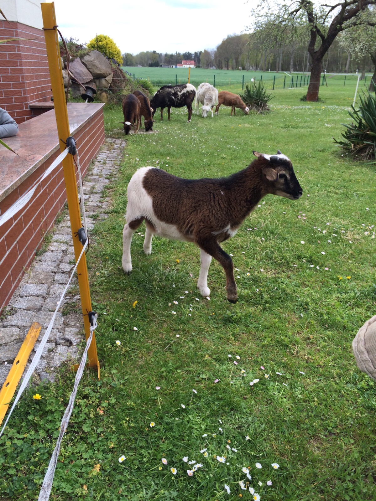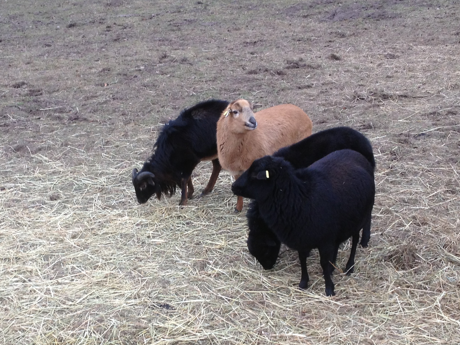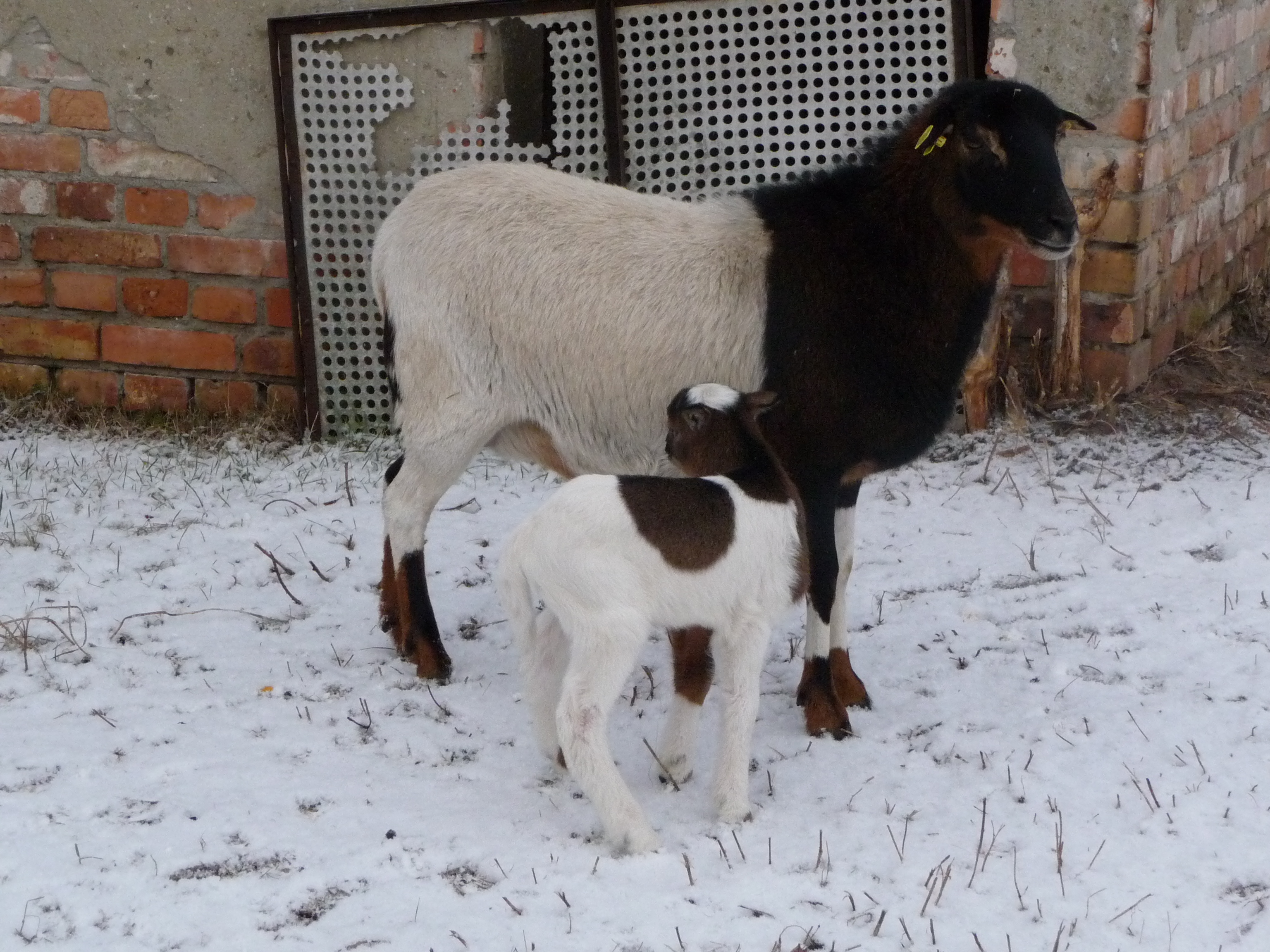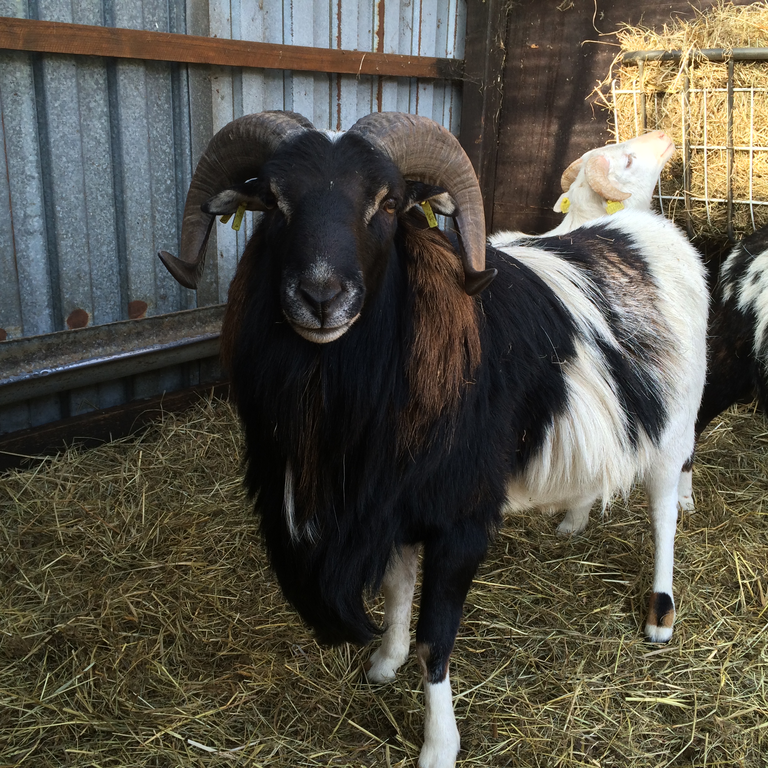 Nun zurück zu den Kamerunschafen. Wie schon erwähnt besitzen auch die Tiere dieses Farbschlages hellbraune Überaugenstreifen, wie zum Beispiel bei den schwarzmarkenen Exemplaren. Diesen ähneln sie in Bezug auf die hellbraunen Abzeichen allgemein sehr stark, man könnte fast sagen der Unterschied besteht nur in der Farbe von Rumpf und Hals. Denn dieses Deckhaar besteht aus zweifarbigem Grannenhaar und schwarzem Unterhaar. Das untere und das obere Viertel der Grannenhaare ist schwarz, der Bereich dazwischen ist gelbbraun gefärbt und macht ungefähr die Hälfte aus. Dieses Zusammenspiel der zweifarbigen Haare ergibt einen wirklich tollen Farbeffekt.